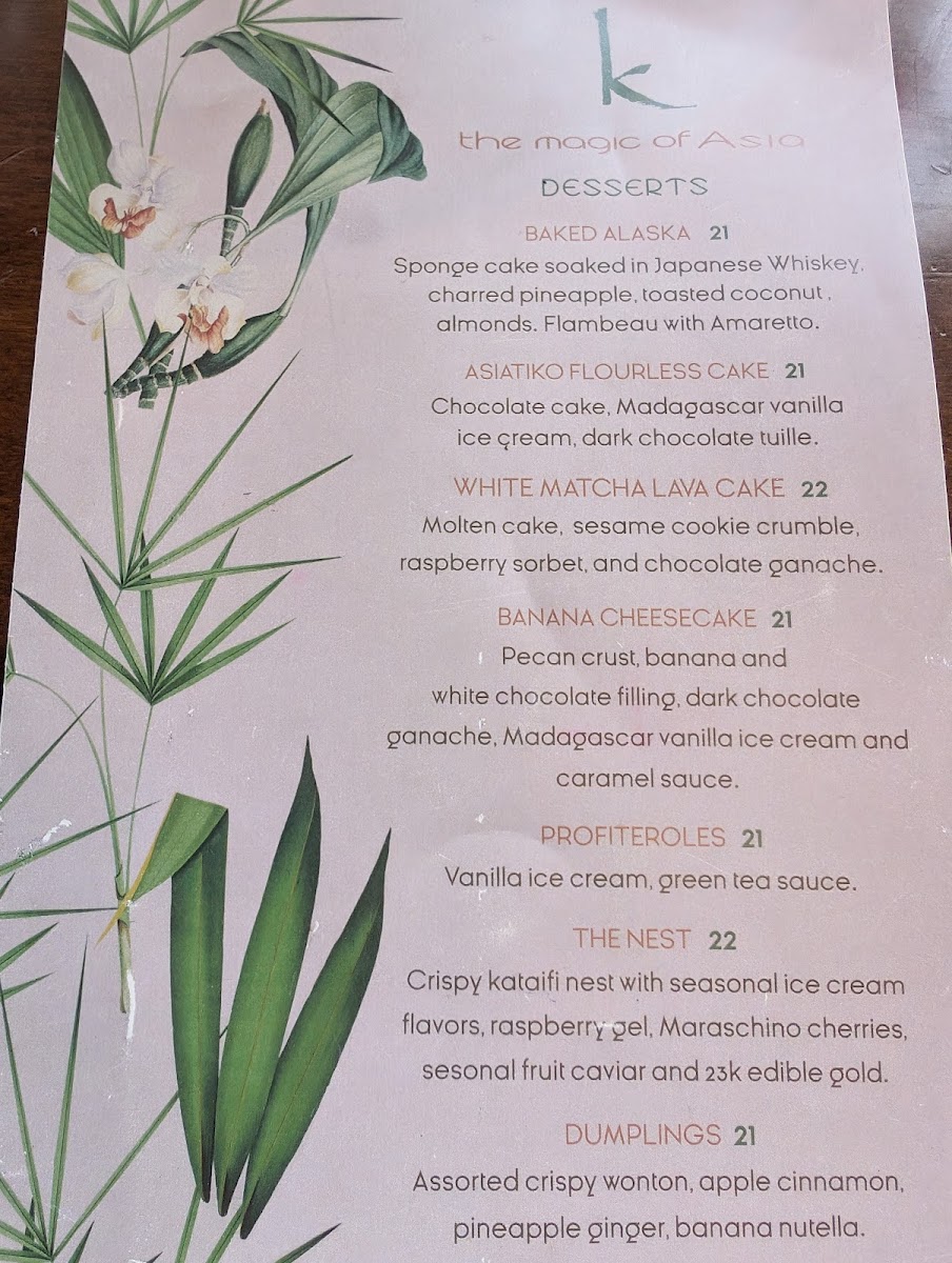 Crispy kataifi nest with seasonal ice cream flavors, raspberry gel, Maraschino cherries, Tangerine caviar and 23k edible gold.